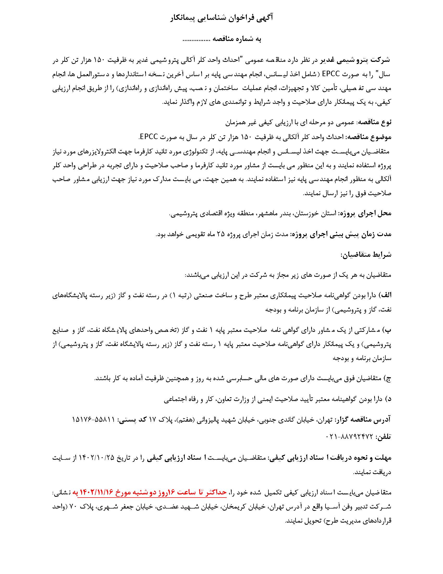 آگهی فراخوان و جداول ارزیابی کیفی پروژه واحد کلر آلکالی با ظرفیت 150 هزار تن کلر در سال بصورت EPCC